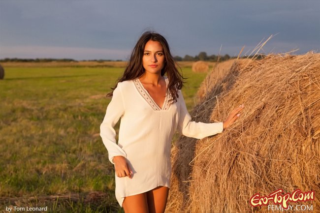 Оказавшись на поле, возле огромного стога сена, красивая голая шатенка с вьющимися локонами и пирсингом в пупке начинает эротично позировать, грациозно приподымая ножку и трогая маленькие сиськи руками. В дальнейшем обнаженная девушка встает на коленки и прогибается раком, демонстрируя крупным планом гладко выбритую письку и попочку.
