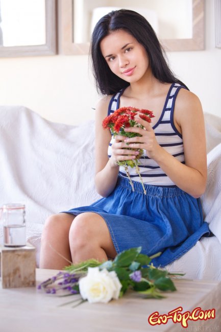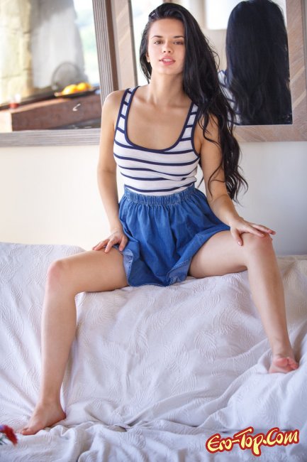 Начав снимать синюю юбку и полосатую майку, очаровательная сексуальная брюнетка устраивается на диване, где в процессе оголяется до трусиков и начинает демонстрировать маленькую грудь. В дальнейшем молоденькая девушка все же прогибается раком и раздевается догола, показывая гладко выбритую письку крупным планом.
