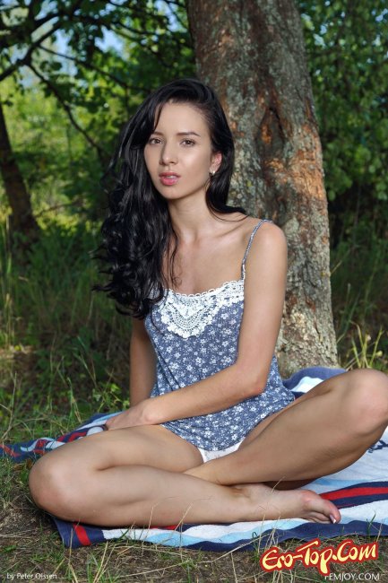 Устроившись на подстилке в лесу и начав наслаждаться свежим воздухом, красивая брюнетка все же не выдержала и в будущем принялась оголиться, снимая сарафан и трусики. Полностью раздевшись, молоденькая девушка с сексуальным телом демонстрирует натуральную грудь средних размеров, а прогнувшись раком засвечивает бритую промежность с возбуждающей гладенькой писькой.