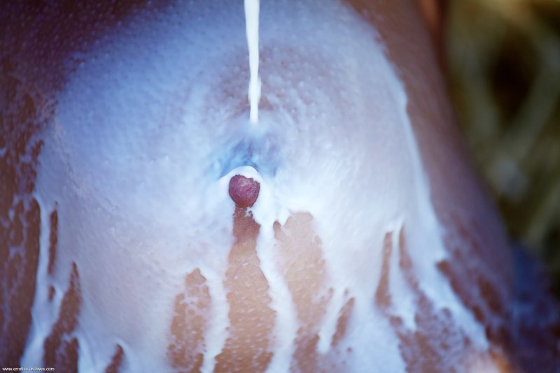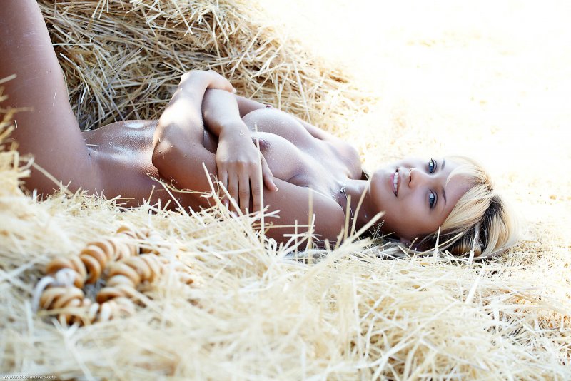 Устроившись на стоге сена, молоденькая голубоглазая блондинка с завязанными волосами в косички, медленно сняв платье и трусики, эротично обливается молоком. И как только прохладная белая жидкость начала стекать по натуральных сиськах и гладко выбритой письке с плоским животиком, ощущая удовольствие, девушка постаралась максимально раздвинуть промежность.