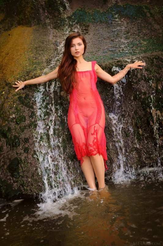 Молоденькая красотка с длинными локонами и плоской грудью, находясь на природе, скинула все лишнее и намочилась под водопадом, параллельно эротично позируя и демонстрируя сексуальное тело. Мило улыбаясь, в будущем очаровательная стройняшка присела на корточки и раздвинув промежность показала мокрую гладко выбритую письку.