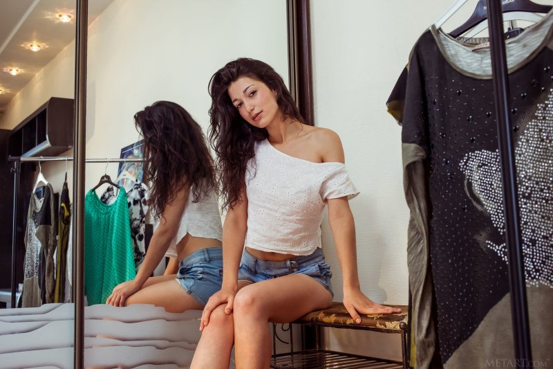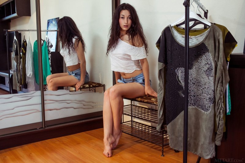 Расположившись дома рядом со шкафом и зеркалом, стройная девушка с возбужденными сосками на натуральной груди в трусиках и белой майке начинает позировать и медленно раздевается перед нами снимая все лишнее, стараясь демонстрировать сексуальное тело с наиболее возбуждающих ракурсов. А оказавшись голой, коасотка грациозно подняла ножки и засветила свою гладко выбритую письку.