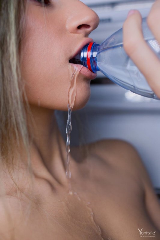 Сексуальная и полностью голая девушка проснулась ночью от жажды и пошла к холодильнику что бы попить прохладной водички, при этом она обливаясь и эротично позировала перед камерой с разных ракурсов. Вскоре страстная крошка демонстрирует влажные маленькие сиськи с набрякшими сосочками, а прогнувшись раком выставляет на обозрение бритую письку с подкаченными ягодицами. А ещё в процессе съёмки, девка нежно трогала себя руками.