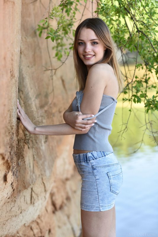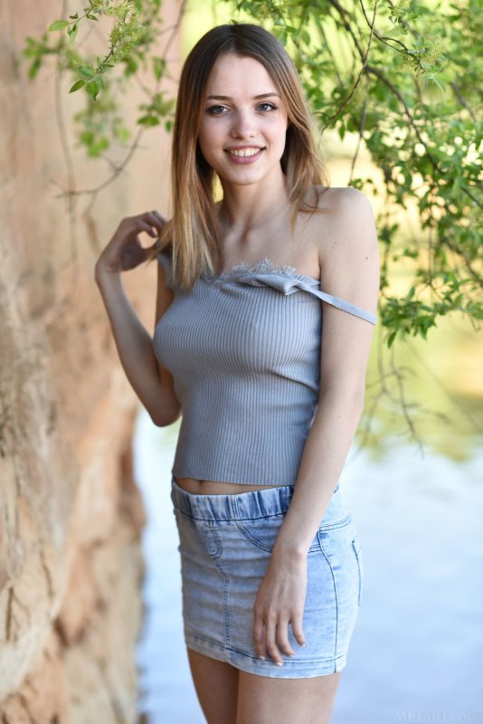 Выбрав наиболее подходящее местечко рядом с речкой на природе, худая девица с милой широкой улыбкой начала эротично позировать в джинсовой юбке и майке, в будущем все же медленно оголяясь. В обнаженном виде стройная крошка с натуральными буферами располагается на песке и прогибаясь раком выставляет попочку с бритой щелкой.