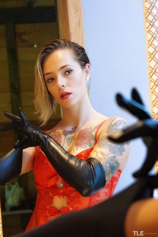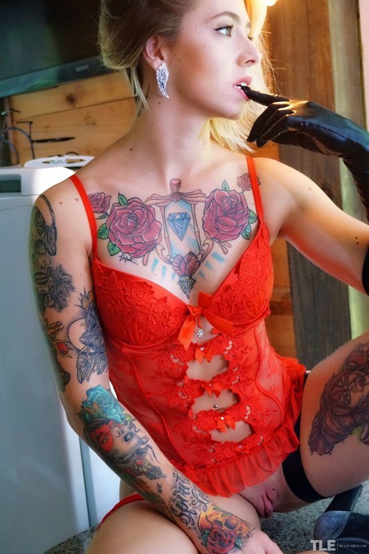 Надев красный корсет, красивая девушка с татуировками на голом теле и повязкой на глазах, но без трусиков, стоя на кухне, начинает страстно и максимально возбуждающе позировать. Показывая сексуальное тело и нежно трогая себя руками, очаровательная крошка забирается на стол, где раздвигая промежность выставляет на показ розовую бритую письку.