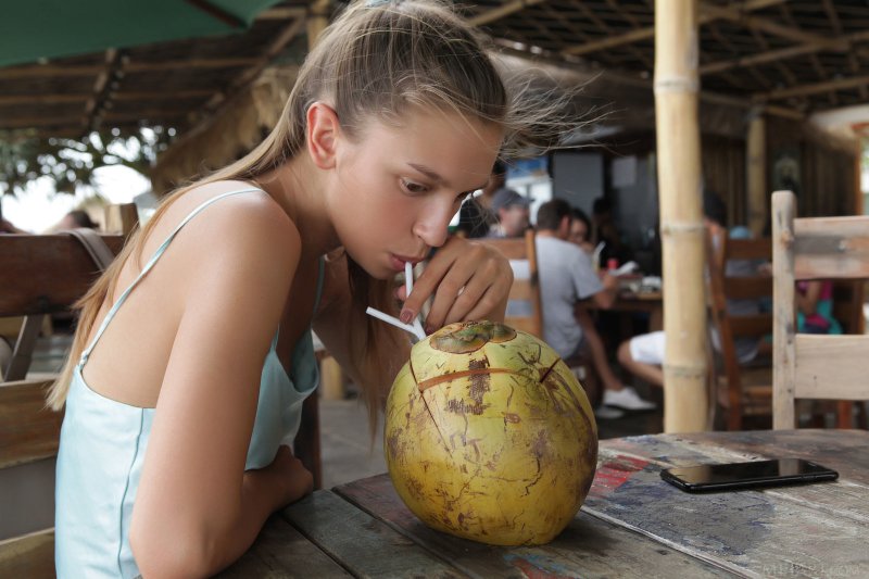 Освежившись в баре свежими коктейлями, симпатичная девушка сняла купальник на пляже и перед камерой показала большие и очень красивые сиськи с аккуратными сосками. После этого красавица позволила взглянуть на бритый лобок с манящей киской, скромно тушуясь в неуверенных позах.