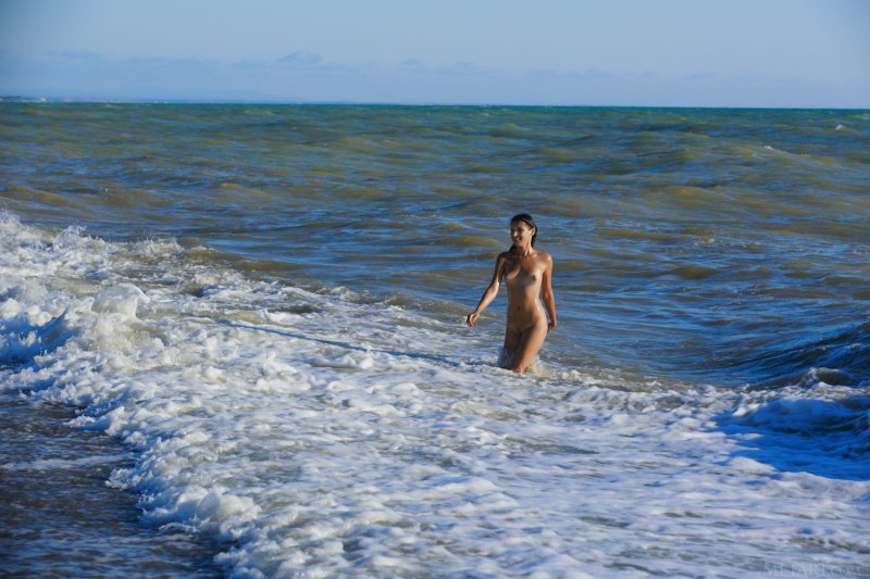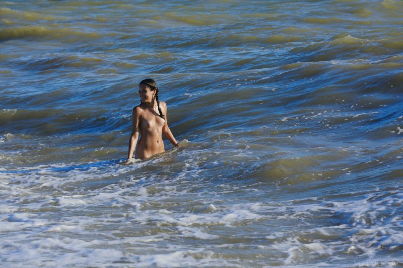 Оказавшись на пляже, молодая привлекательная девушка с косичками медленно снимает купальник и начинает эротично позировать, прогуливаясь по берегу и даже забираясь в воду по пояс. Таким образом сексуальная красотка смогла продемонстрировать маленькие сиськи с бритой писькой и мокрую попу.