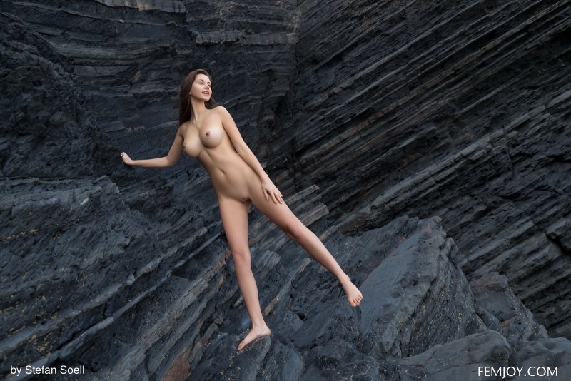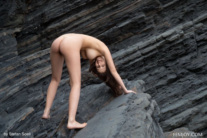 Позируя на пляже рядом со скалами, полностью голая девушка с большими и до безумия шикарными титьками, старается продемонстрировать своё сексуальное тело с самых возбуждающих ракурсов. После того как красотка показала нам бритую письку с гладким лобком, она поворачивается спиной и прогнувшись раком оттопыривает сочную задницу.