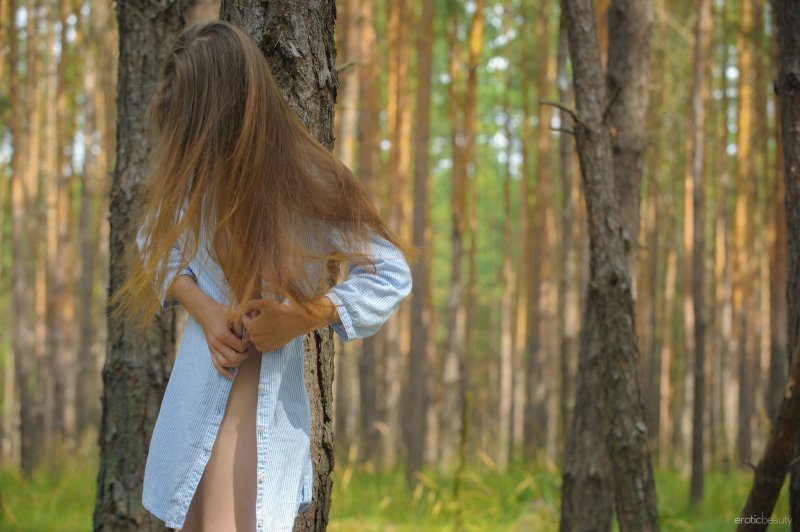 Эротика » Красивая эротика » Девица в рубашке на голое тело позирует в лесу