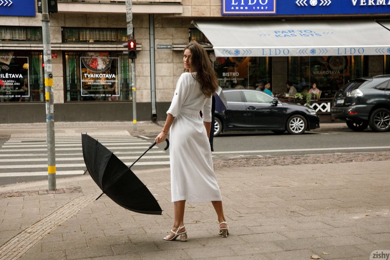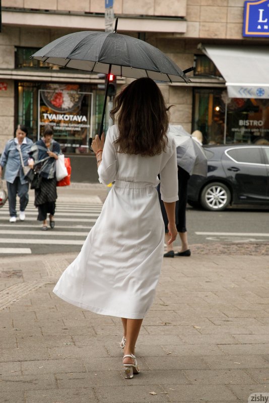 Вооружившись зонтом, длинноногая девушка в плаще отправилась непринуждённо гулять и наслаждается погодой на улице, в некоторые моменты демонстрируя упругую попку в чёрных трусиках. В конечном итоге все заканчивается тем, что сексуальная мадама садится в машину на заднее сидение, где встаёт раком задрав подол и приглашает нас заняться чем-то непристойным, но жутко приятным.
