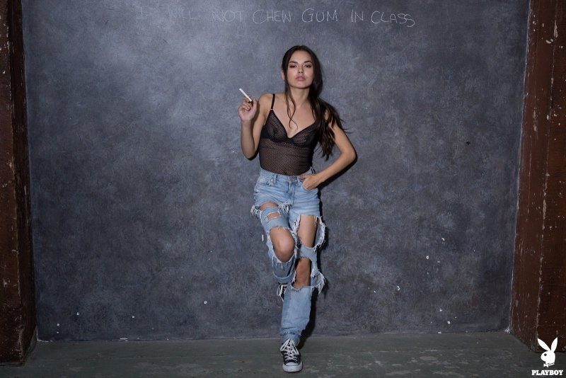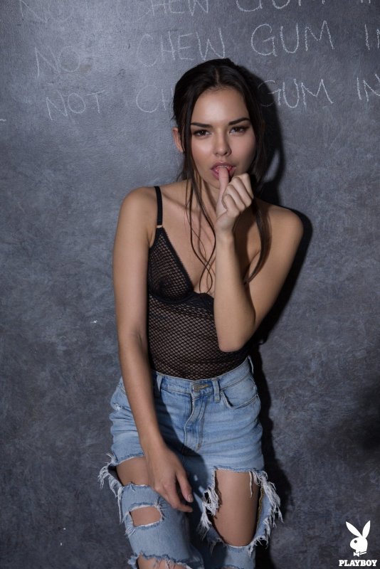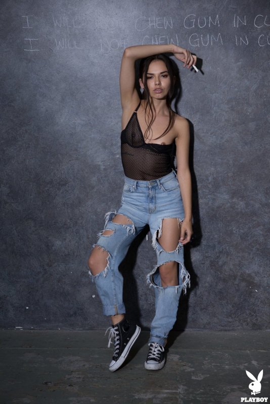 Молодая и невероятно сексуальная красивая модель с худенькой талией начинает эротично позировать в порванных джинсах и полупрозрачном боди. В будущем стройняшка с маленькой грудью медленно раздевается и немного засвечивает упругую попку с гладенькой писькой и лобком.