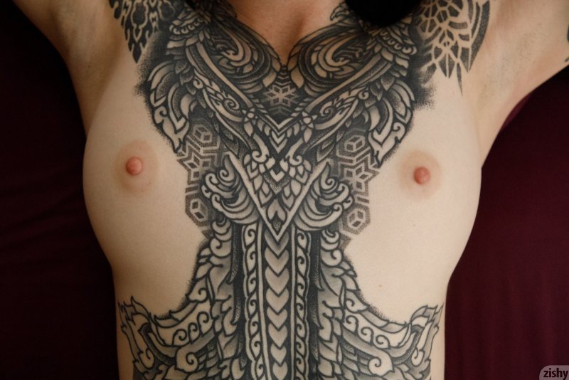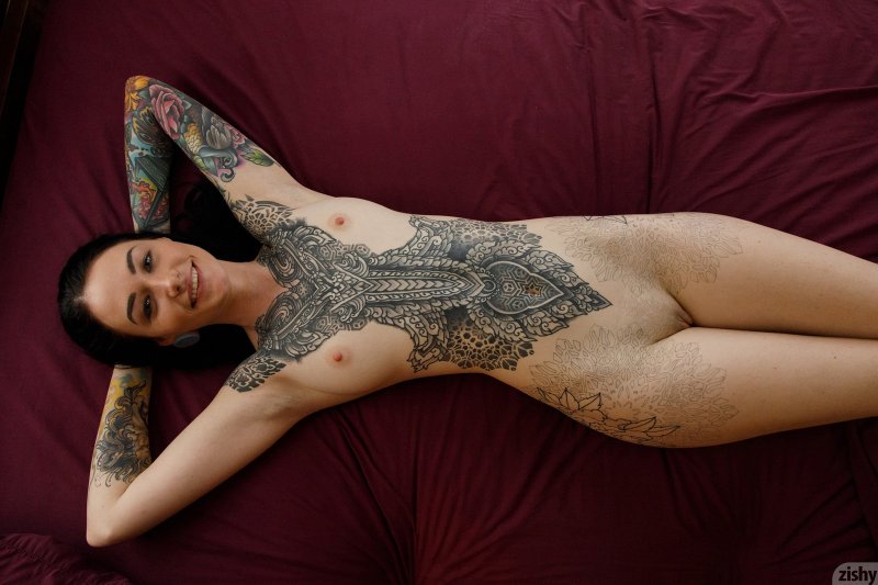 Медленно раздевшись до гола, обаятельная темноволосая брюнетка с худенькой фигурой и татуировкой почти на все сексуальное тело берется эротично позировать на кровати. Лежа на спине, стройняшка с натуральными буферами грациозно выгибается и лучше всего показывает бритую письку с лобком.