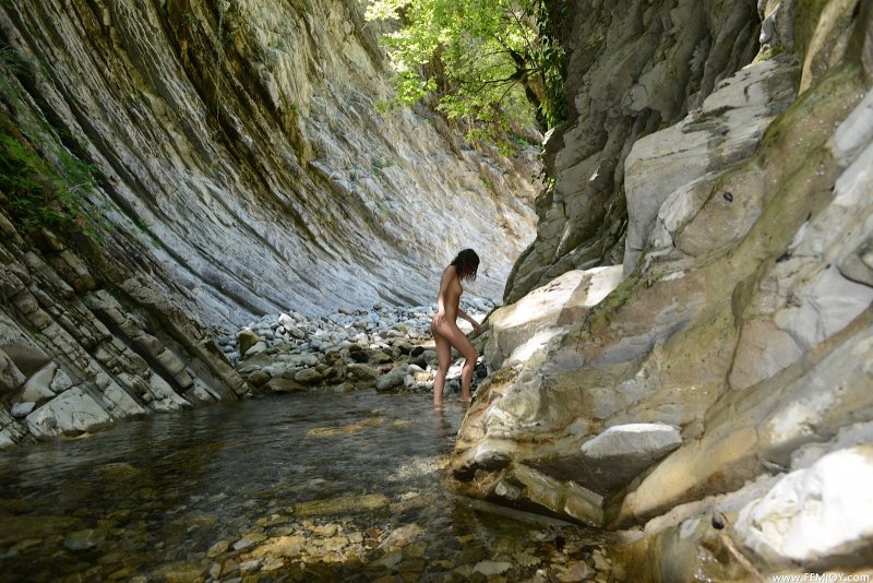 Гуляя на природе в небольшом каньоне и смачивая ножки в ледяной речке, голая девушка встаёт на четвереньки перед камерой и прогибается раком. Таким образом сексуальная стройняшка с маленькими сиськами оттопыривает соблазнительную попку, а так же засвечивает бритую возбуждающую письку.
