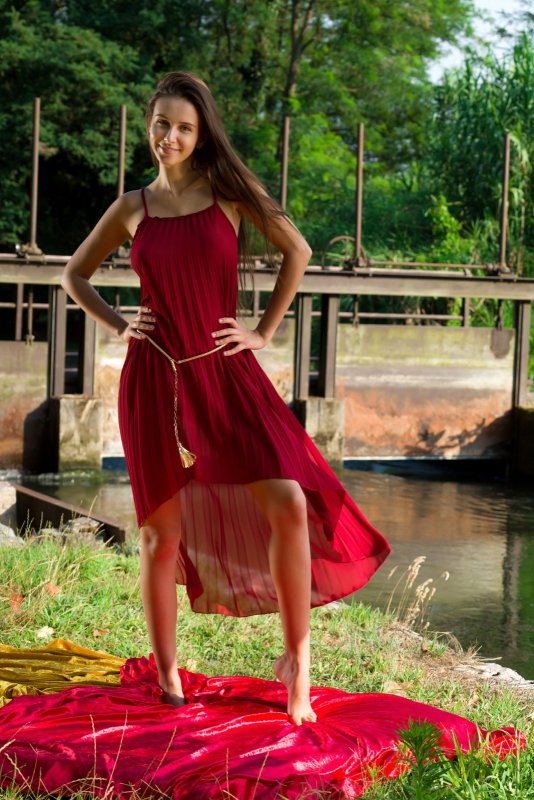 Устроив соблазнительную съёмку перед фотокамерой, нежная и довольно грудастая няшка с худенькой талией начала эротично позировать и медленно снимать длинное платье. Оголившись, стройная красотка подробно демонстрирует натуральные сиськи и бритую письку с гладким лобком, порой вставая на коленки и поглаживая волосы руками.