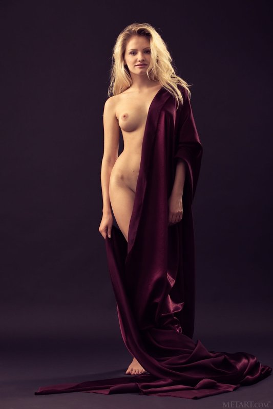 Соблазнительно прикрываясь бардовой тканью, секси блондинка с очаровательной внешностью и прекрасным телом, старается чередовать самые возбуждающие ракурсы, позируя для фото в стиле ню. Спустя несколько минут после начала съёмки, молодая девушка уже во всей красе позволяет нам разглядеть её упругие сиськи и попку с гладко выбритой писькой.