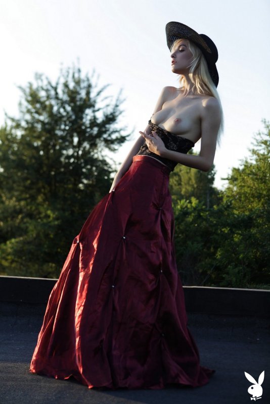 Нарядившись в необычный наряд, светловолосая украинка с пронзительным взглядом устраивает на крыше эротичную фото сессию от студии PlayBoy. Возбуждаясь от позирования, сексуальная девушка в процессе медленно раздевается и немного засвечивает маленькие сиськи и гладкий лобок.