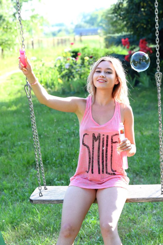 Очаровательная нежная блондинка в розовой майке без трусиков, устроившись на качели в парке, завораживающе позирует и улыбается нам. Испытывая сильное удовольствие от происходящего с ней, стройная девушка в какой-то момент скинула с себя все лишнее и засветила упругие сиськи с вожделенной писькой.