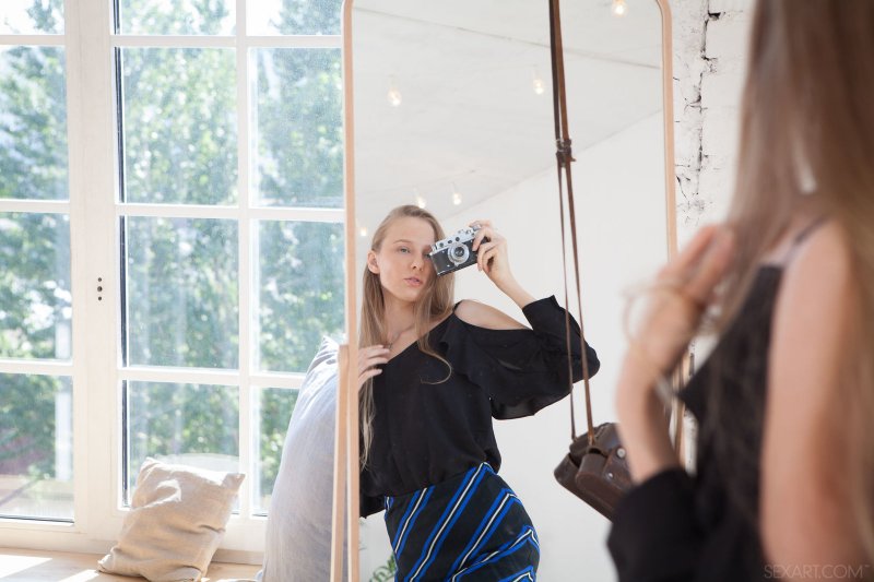Получив увлекательное предложение сняться в эротической фото сессии, эта красавица не долго думала. И вот, эта очаровательная особа оказалась в импровизированной спальне, где она сняла трусики и совершенно голая забавляется со своей бритой киской, лаская и проникая в неё пальчиками. Девушка уверенно ведёт себя перед фотографом и несмотря на лёгкое смущение в её взгляде, охотно принимает самые откровенные позы.
