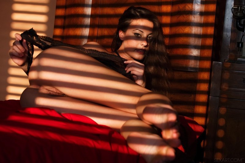 Надев ажурное нижнее бельё, обнажённая девушка с худенькой талией устраивается в постели и обольстительно позирует в полумраке, ощущая на себе томные взгляды возбуждённого фотографа и испытывая от этого необычайное удовольствие. Довольно быстро красавица с маленькой грудью разделась до гола и стоя раком соблазняет нас своей желанной киской с волосиками на лобке и половых губах.
