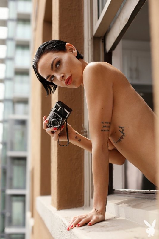 Совершенно не заботясь о том, что её могут увидеть соседи, обнажённая брюнетка лихо высовывается в окно, пока фотограф плейбоя снимает её из другого. Красавица с ярким макияжем особо не скромничает и позволяет нам насладиться всеми её прелестями, то и дело меняя одну возбуждающую позу на другую, ещё более откровенную и околдовывающую зрителя.
