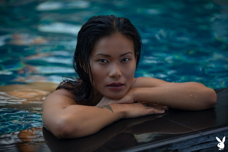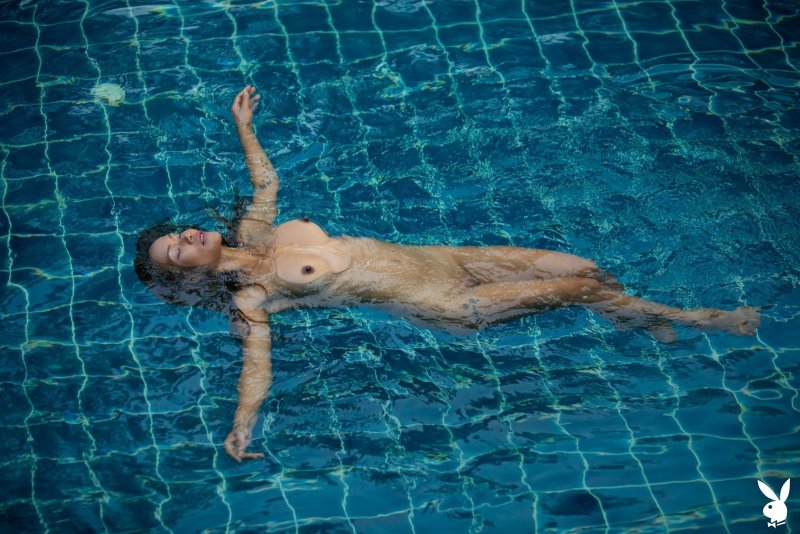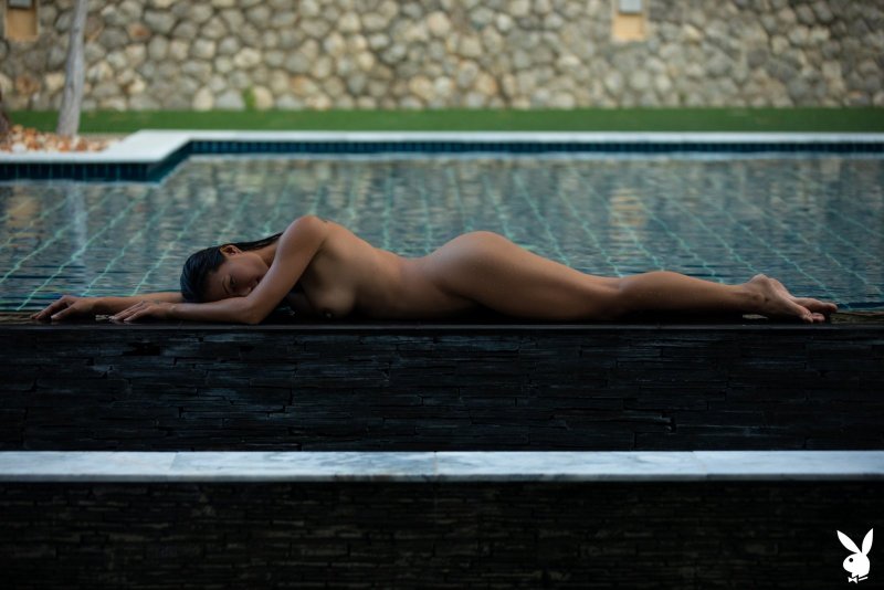Обаятельная азиатская модель с худенькой фигурой, скинув с себя купальник, забирается в бассейн и плавает там, пока фотограф щёлкает её на камеру. Испытывая от происходящего приятные чувства, сексуальная девушка с натуральной грудью и торчащими сосочками в процессе поднималась из воды и делала акцент на гладко выбритой письке и животике.
