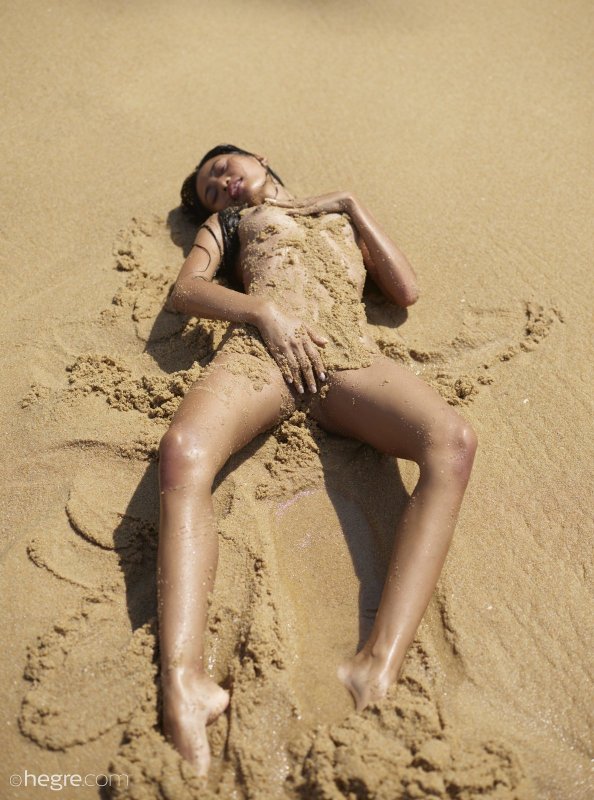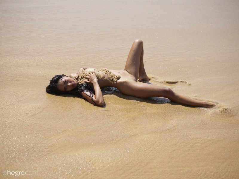 Не долго думая она согласилась на откровенную съёмку на пляже, и вот сексуальная, абсолютно голая тайка красуется перед камерой в песке, измазываясь с ног до головы, и испытывает от этого подлинное удовольствие. В процессе стройная азиатка с плоскими сиськами и торчащими сосочками засвечивала попку и бритую письку, порой забираясь в воду.