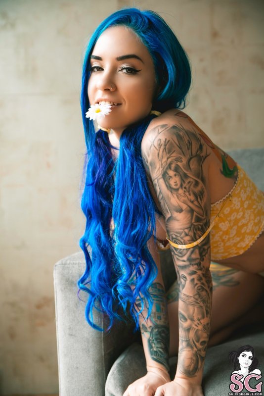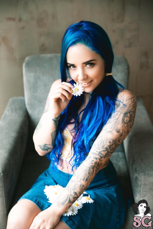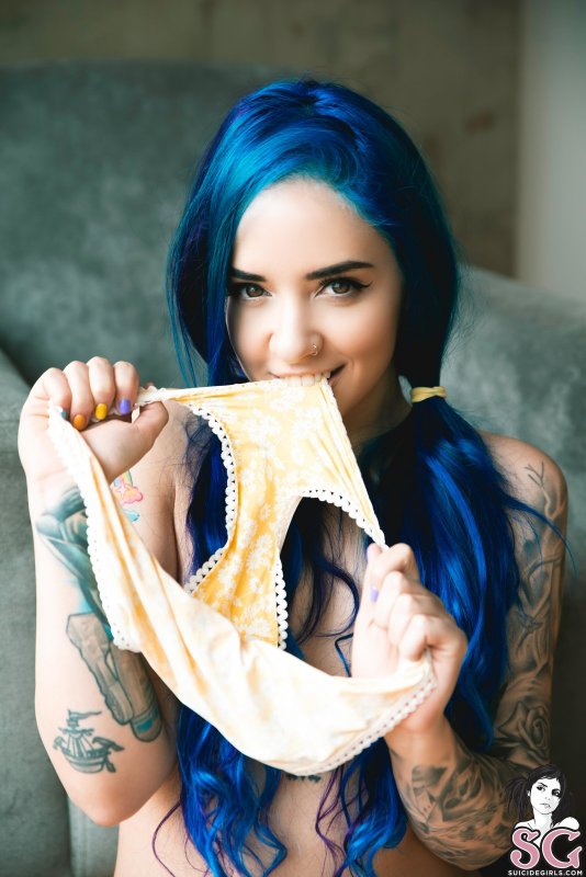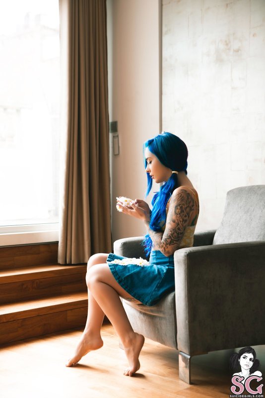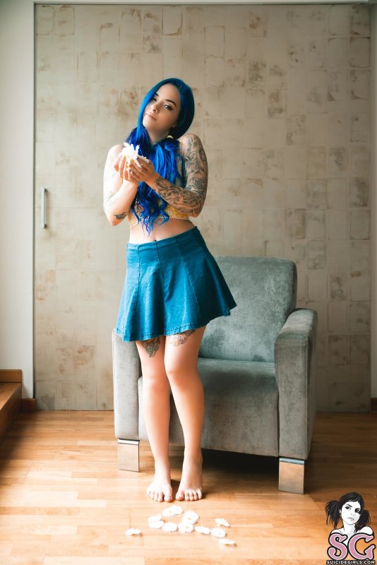 Босая милая неформалка с синими волосами в неглиже, надев юбку с трусиками и топик, эротично позирует дома и улыбаясь строит глазки в камеру. Соблазняя нас своим скромным взглядом, сексуальная модель вскоре раздевается догола и предстаёт перед нами во всей своей красе, смущённо прикрывая маленькие сиськи и скрещивая ноги.