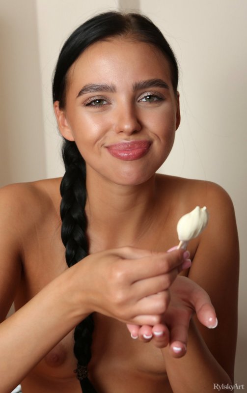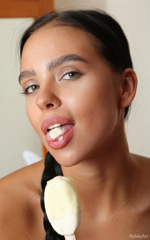 Усевшись на тумбочке, абсолютно голая и невероятно сексуальная брюнетка с длинной заплетённой косой и пухлыми губками соблазнительно лижет мороженное перед камерой. Между тем, красавица охотно позволяет нам полюбоваться её небольшой грудью и прочими прелестями обнажённого тела.