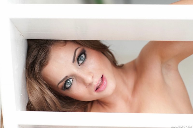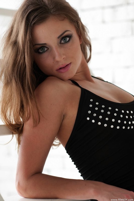 Устроившись на лестнице в фото студии, красивая и очень соблазнительная модель в чёрных чулках стягивает с себя короткое платье и грациозно вытягивается на ступеньках. Получая удовольствие от съёмки, стройняшка с маленькой грудью в дальнейшем принимала и другие ракурсы, что позволило ей засветить попку и бритую письку.