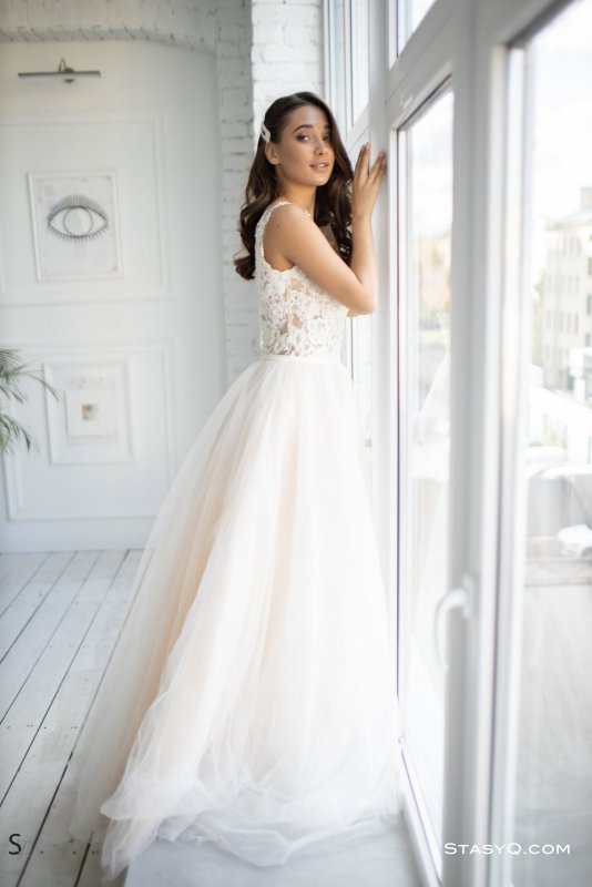 Эротика » Красивая эротика » Сексуальная невеста в чулках позирует в платье и без