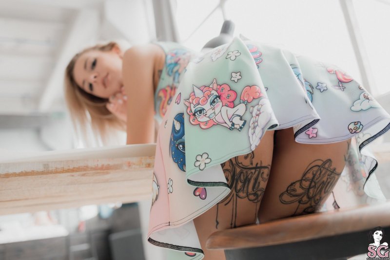 Эротика » Красивая эротика » Милая девка в татуировках эротично задирает юбку