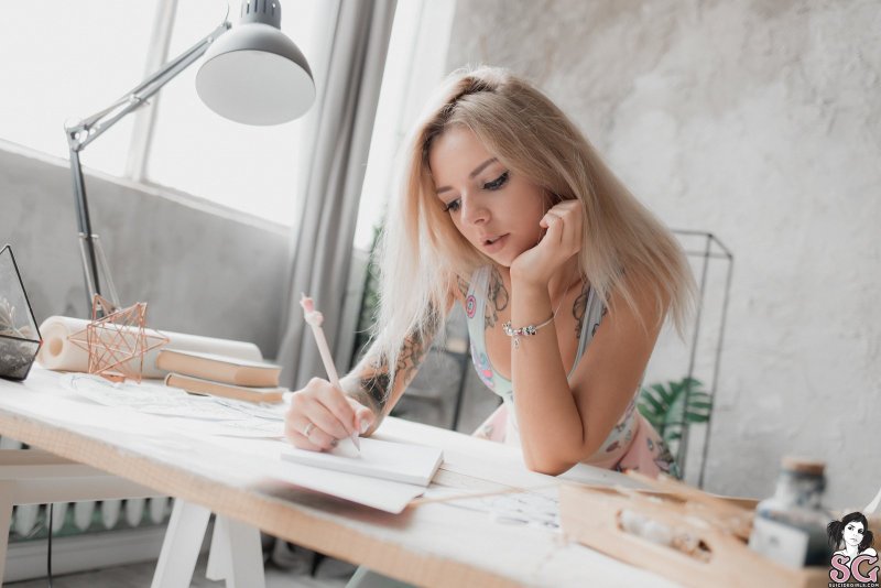 Молодая милая девка в татуировках по всему телу позирует перед камерой и эротично задирает юбку, после чего акцентирует наше внимание на её белых трусиках. Получая от фотографа ценные указания, сексуальная блондинка порой показывала маленькие сиськи и возбуждающую письку с упругими ягодицами, делая это очень соблазнительно и страстно.