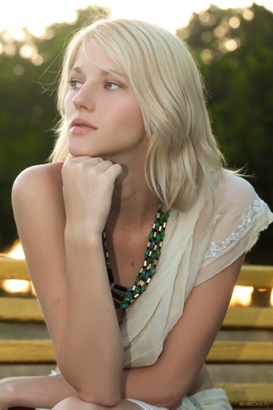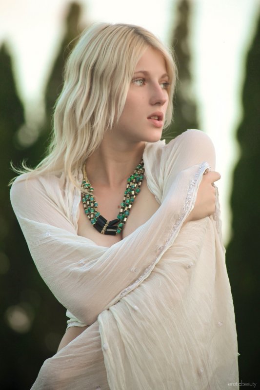 Игриво прикрываясь легкой тканью, белокурая милашка с голым сексуальным телом эротично прогуливается вечерком по парку. Красуясь перед фотографом в общественном месте и вызывая таким образом лёгкое возбуждение, стройная девушка во всей красе показывала свои упругие сиськи и бритую письку с короткой прической на лобке.
