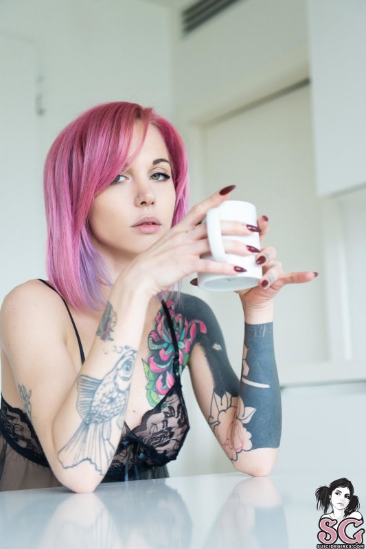 Сексуальная красавица в татуировках эротично позирует на кухне и забираясь на стол оголяет упругие сиськи с торчащими сосочками. Меняя разные ракурсы, горячая сучка с яркими розовыми волосами так же порой акцентировала внимание на бритой письке, которая виднелась через приспустившийся пеньюар.