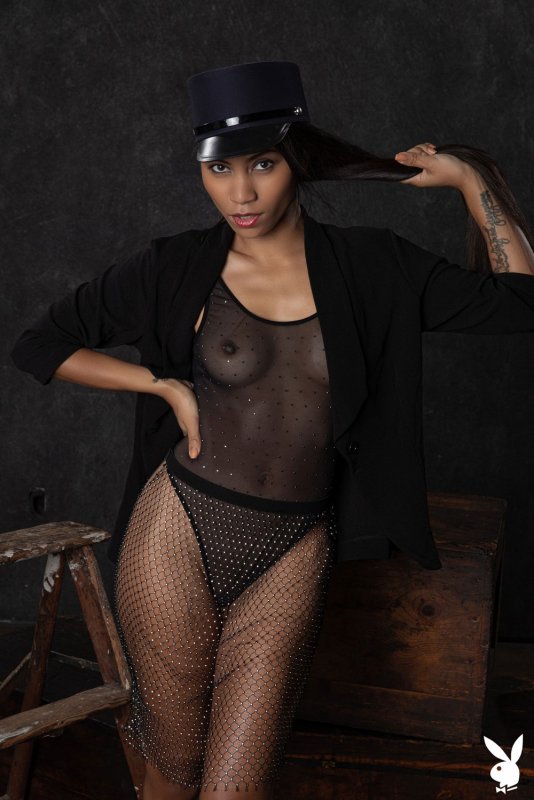 На очередной фотосессии, страстная мулатка в сексуальной черной форме показывает на камеру свою бритую киску. Развратной брюнетке нравится быть в центре внимания и с удовольствием демонстрирует всем желающим свои маленькие упругие сиськи с острыми темными сосками и аппетитную подтянутую попку.
