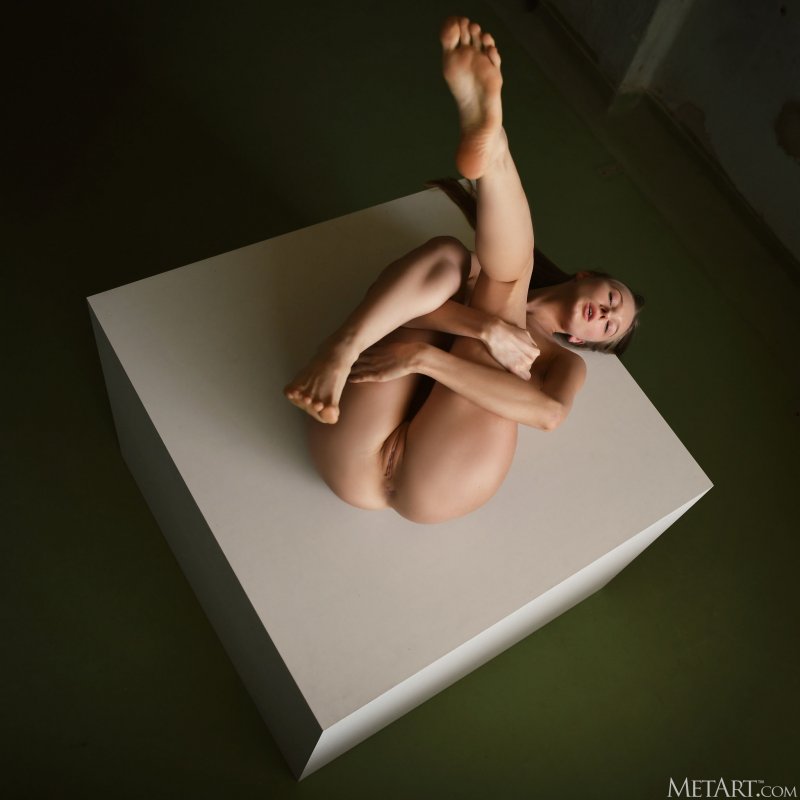 Изящная голая гимнастка принимает участие в необычной фото-сессии и красиво извивается всем телом на кубе, завораживая всех, кто увидит ее. Обнаженная девушка благодаря всем необыкновенным позам позволяет увидеть свои маленькие титечки и бритую аккуратную писечку крупным планом.