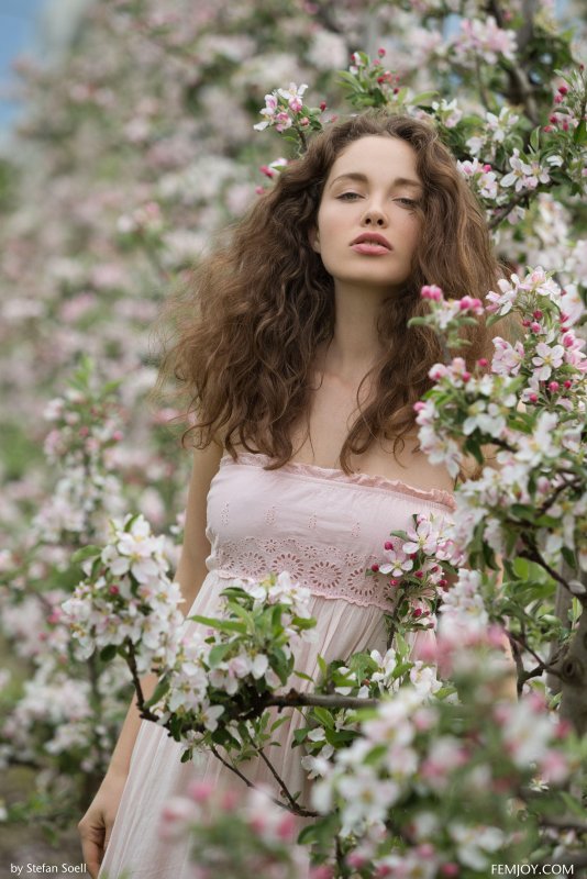 Соблазнительно скинув с себя платье, кудрявая красавица с шикарной возбуждающей фигурой гуляет по большому цветущему саду. Сексуальная девушка с большой упругой грудью чувственно изгибается в разных эротичных позах, игриво демонстрируя на камеру свою аппетитную мягкую попку и пушистый лобок.