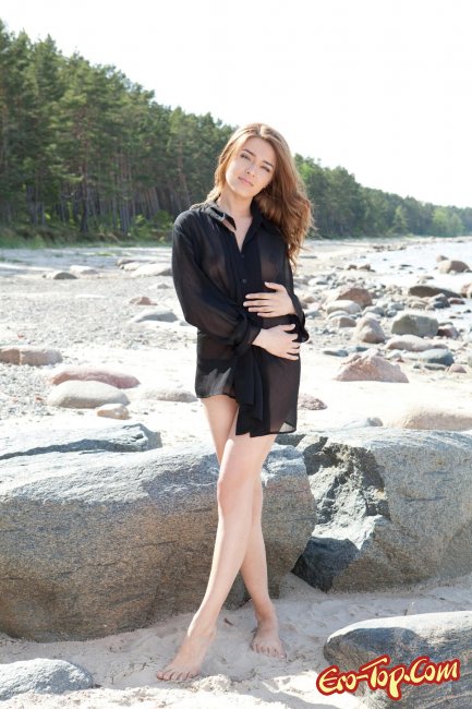 Молодая, красивая девушка разделась на берегу, сняв чёрное бельё со своего необыкновенно привлекательного и сексуального тела. Девушка стройна и красива, у неё маленькая, очень красивая и аккуратная грудь с милыми сосочками, сладенькая попка и спортивный животик. За спиной девушки мы можем видеть густой лес, а под её ногами камни, на которых её хрупкое тело кажется беззащитным и ранимым.