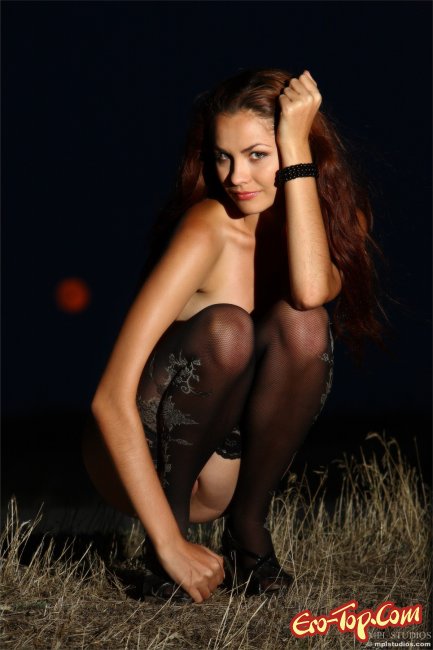 Очаровательная рыжая девушка позирует голой в чёрных чулках на фоне заката. У девушки маленькая груди и вместе с тем очень сексуальное тело, которое в лучах уходящего солнца смотрится невероятно соблазнительно и возбуждающе. Девушка всячески пытается нам понравится, принимая для этого различные откровенные позы и широко улыбаясь в камеру, её улыбка пленит своей красотой и доброжелательностью. Красавица устроит нам вечер в стиле романтик на пустынном поле...
