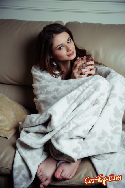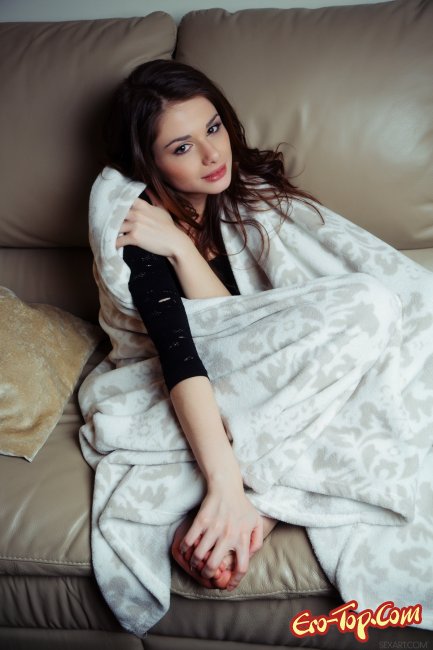 Фото сет начинается с того, что красивая, голая брюнетка пьёт какао на диване у себя дома. Красотка накрыта пледом, который согревает её хрупкое, стройное тело. Но скоро малышка согревается и сперва скидывает одеяло, а затем и трусики с кофточкой. И вот очаровательная особа совершенно голая, позирует перед камерой, соблазняя нас своим превосходным телом, демонстрируя упругую грудь, пышную попку и бритую киску с большими половыми губками.