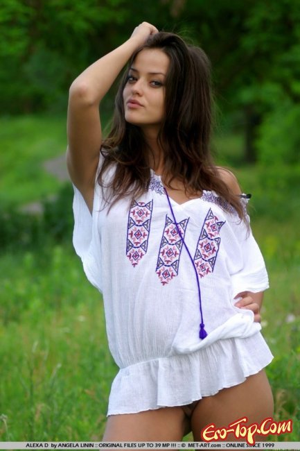 Теплым деньком, красивая молоденькая брюнетка Alexa D согласилась обнажить свою юное стройное тело на красивой поляне среди фиолетовых диких цветов лаванды. Полностью обнажившись, фотомодель в одних только сапожках на каблуках начала грациозно позировать. Следует отметить, что у девушки небольшая грудь, сочная попка, пирсинг в пупочке и бритая киска с интимной стрижкой "узкая взлетная полоса".