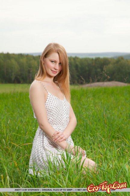 Соблазнительная девушка, привлекательная блондинка в летнем платье, пришла на поле с ярко-зелёной травой, где и скинула с себя всю одежду, оставшись совершенно голой. У юной красавицы отличное, стройное тело с маленькой грудью и потрясающей упругой попкой с немного пухленькими ягодицами. Так же нам удастся насладиться видом гладко бритой киски девчонки с розовыми половыми губками.