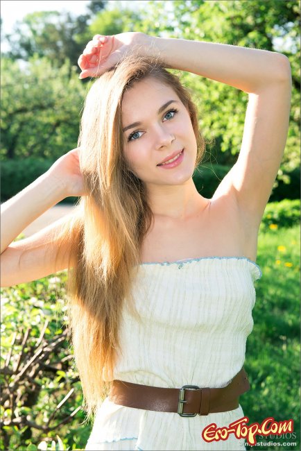 Молодая, голая девочка позирует на природе, удобно устроившись на сочной, зелёной травке. Блондинка с маленькой грудью и упругим телом, сняла платье, под которым у неё нет нижнего белья и с радостью и энтузиазмом приступила к соблазнению своих зрителей. Особенно возбуждающе выглядит розовая пися девчоночки, с пухленькими половыми губками без волос.