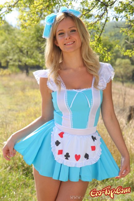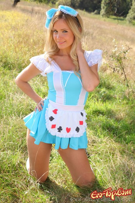 Эта красивенькая сучка видно сбежала с кафе в рабочей униформе, которая так сексуально на ней смотрится и попала на фото сессию на природе. Милая блондинка снимает платье под которым эротичное нижнее белье синего цвета, затем девушка в гольфах снимает лифчик и оголяет упругие большие сиськи, а затем и трусики, но киску прикрывает руками.