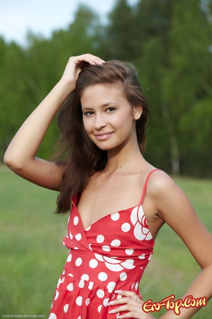Красивая молодая девушка провела свой первый эротический фото сет на природе. Она выехала в поле, где зеленая травка и поют птички. Малышка снимает с себя красное платье в белый горошек и начинает позировать. Телка показывает маленькие груди, а потом становится раком, чтобы показать миниатюрную попку с тугой анальной дырочкой.