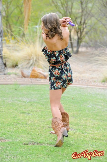 Яркая на вид девушка позирует в сапогах и красивом летнем платье. Симпатичная девушка проводит свой эротический фото сет где-то в загородном доме или на даче. Девушка улыбаясь начинает оголять упругую грудь, а потом раздевается до черных трусиков, которых вскоре также не оказывается на ее попке.