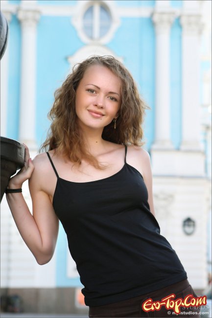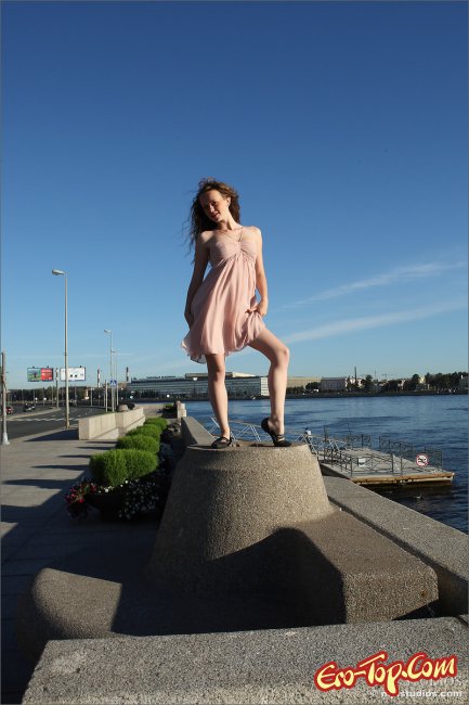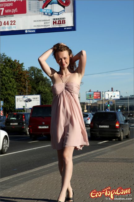Великолепная молодая девушка с кучеряшками, ходит по городу в нежно розовом платье без трусиков и освежает свою киску. Красотка в пути останавливается в публичных местах где много машин и там показывает свою гладко побритую киску.