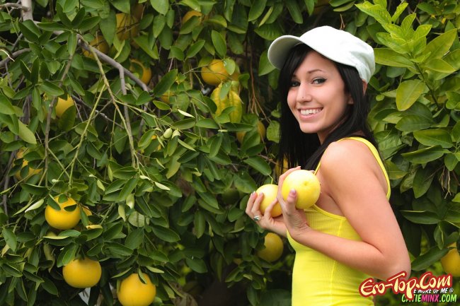 Очаровательная брюнетка с большими красивыми глазками, эротично позирует в зеленом лимонном саду. Девушка садится на шпагат, а потом снимает с себя желтую маячку с белыми шортиками и сравнивает свои упругие груди с двумя лимонами. Потом сучка остается вовсе голенькой, демонстрируя свои прелести стройного тела.
