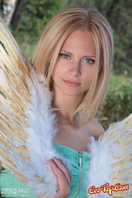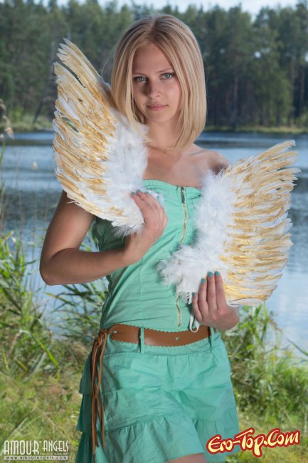 Сексапильная девушка с крыльями ангела, проводит эротический фото сет на природе. Миленькая блондинка снимает с себя бирюзового цвета платье и оголяет упругую грудь. Потом белобрысая куколка стягивает трусики и ложится на постеленное покрывало на травке и начинает показывать свою узкую писю с гладким лобком. Затем девочка поворачивается к нам маленькой попой и подставляет крылышки за спину.
