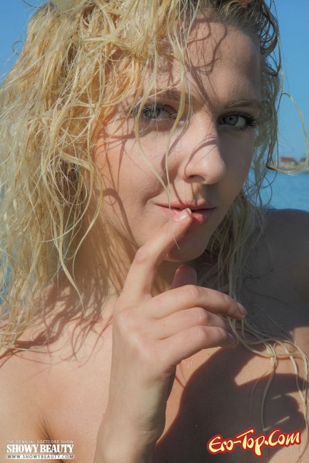 Белокурая красивая девушка раздевается на берегу речки и начинает сексуально позировать в эротических позах. Блондинка снимает черные трусики и показывает свою классную попку с гладкой писей крупным планом. Потом мокрая сучка стоит по колено в воде и демонстрирует свою худенькую фигурку с маленькими сиськами.